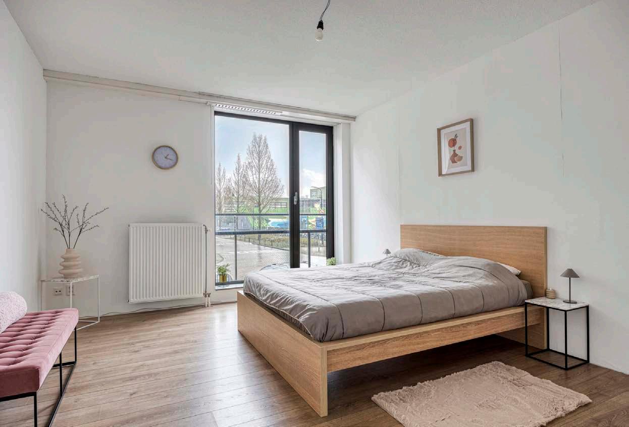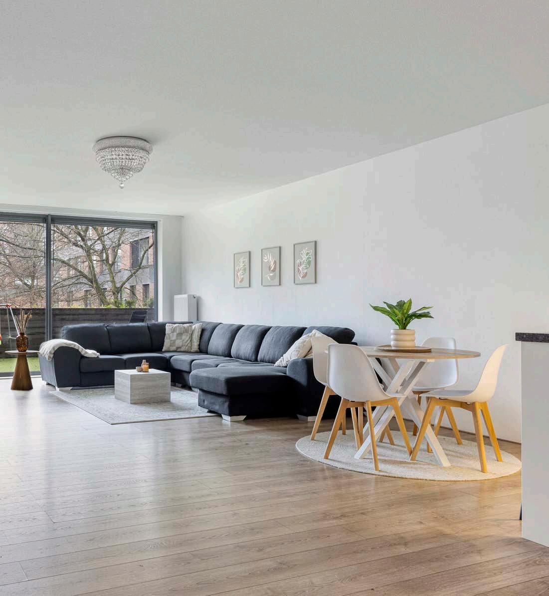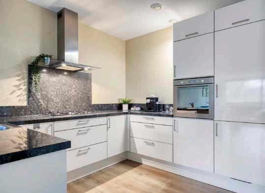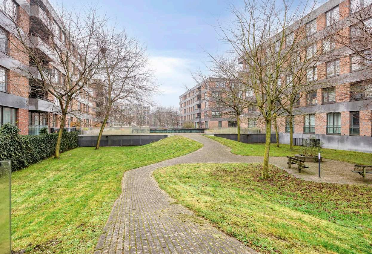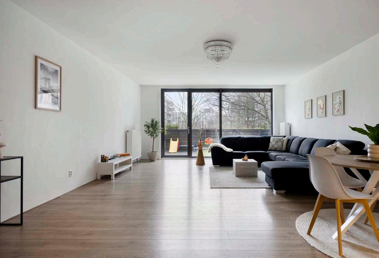 Een indrukwekkende woonkamer met een open keuken voorzien van een eiland. De enorme lichtinval, dankzij de in hoogte doorlopende ramen aan de achterzijde, onthult een prachtig uitzicht op de gemeenschappelijke binnentuin. Vanuit de woonkamer leidt een openslaande deur naar het zonnige terras, gelegen op het westen.