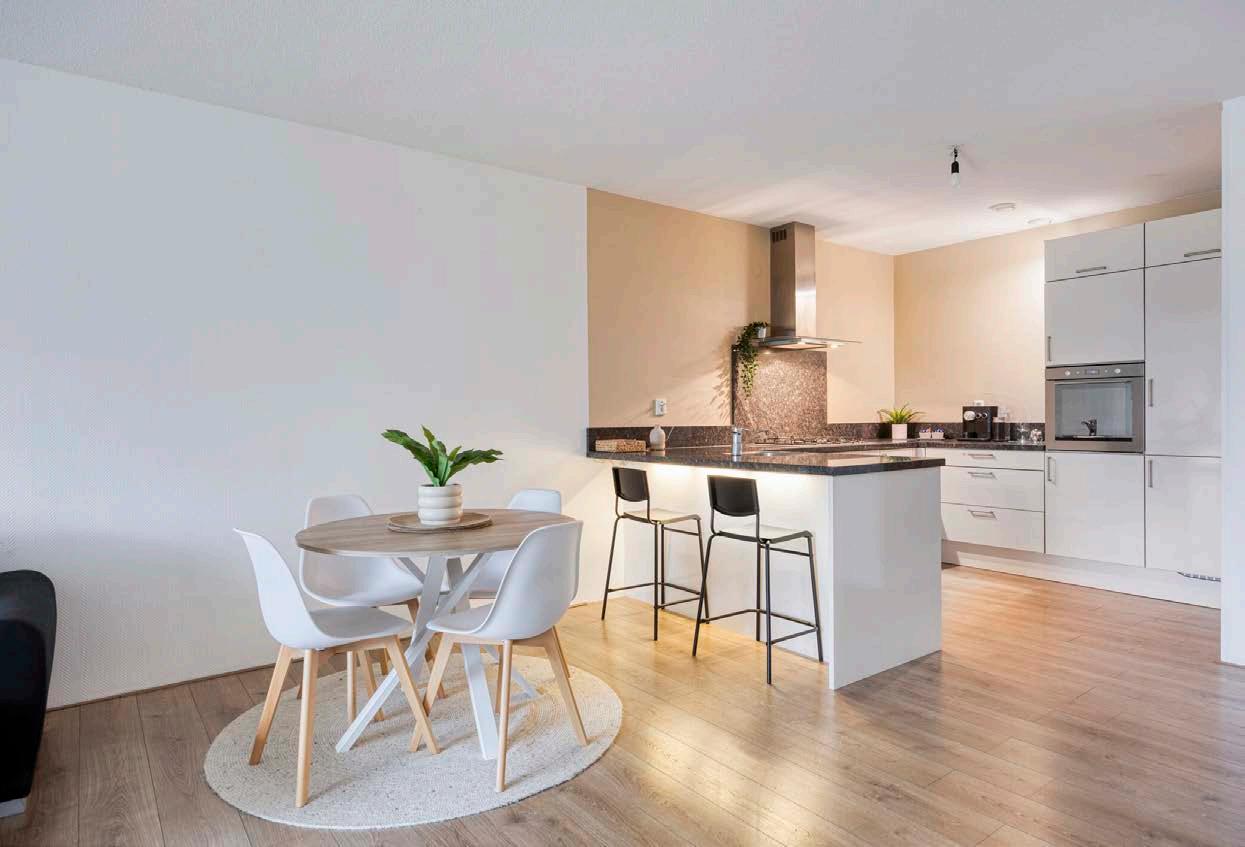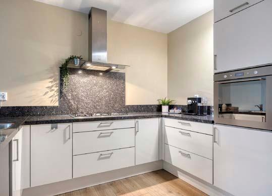 De keuken is ingericht in een U-opstelling en beschikt over een spoeleiland en een natuurstenen werkblad. Hij is volledig uitgerust met moderne apparatuur, waaronder een grote oven, een koelvriescombinatie en een afzuigkap.