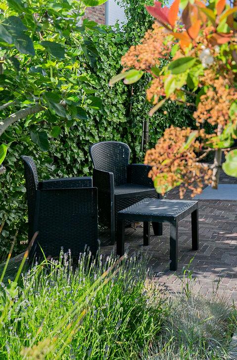 De tuin strekt zich uit rondom het huis, waardoor er verschillende gezellige hoekjes ontstaan.
