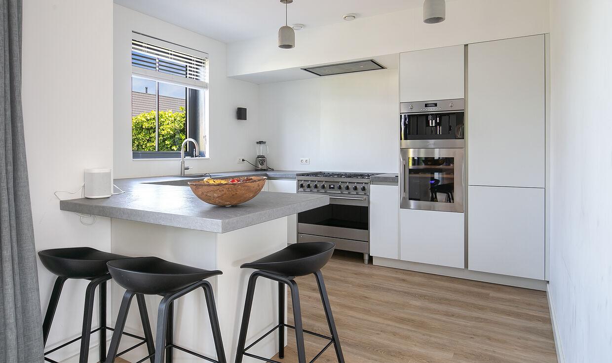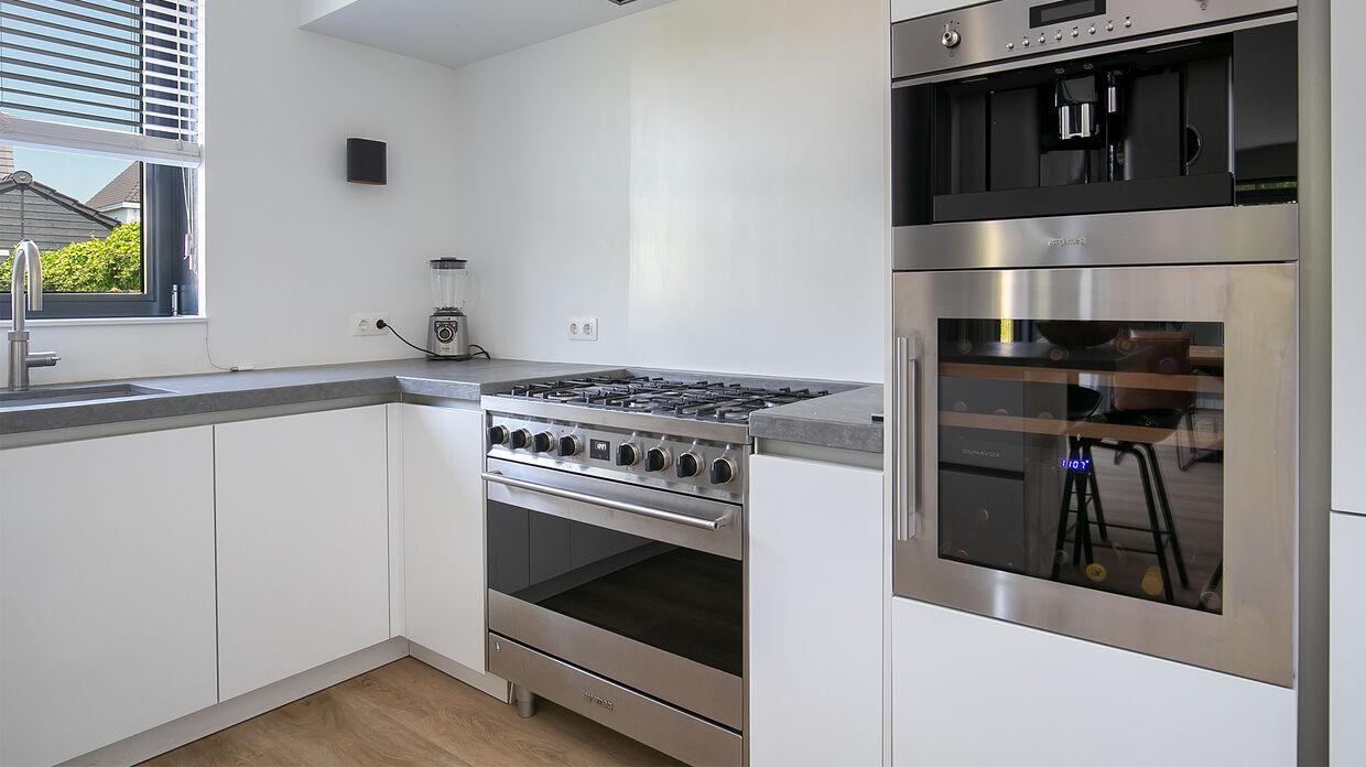 De luxe woonkeuken is een fijne ruimte waar eveneens veel daglicht naar binnen valt. De keuken is geplaatst in U-vorm en is voorzien van een natuurstenen aanrechtblad. Verder ben je voorzien van alle denkbare inbouwapparatuur, zoals een Quooker kraan, Siemens vaatwasser, Smeg oven, wijnkoelkast, koffieautomaat en gaskookplaat.