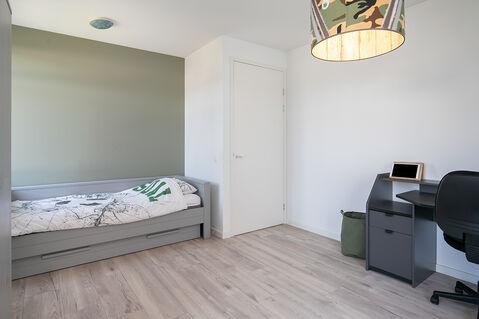 Met de vaste trap bereik je de tweede verdieping. Hier tref je nog twee slaapkamers, een inloopkast, de tweede badkamer en een technische ruimte met de cv-ketel en de omvormer voor de zonnepanelen.