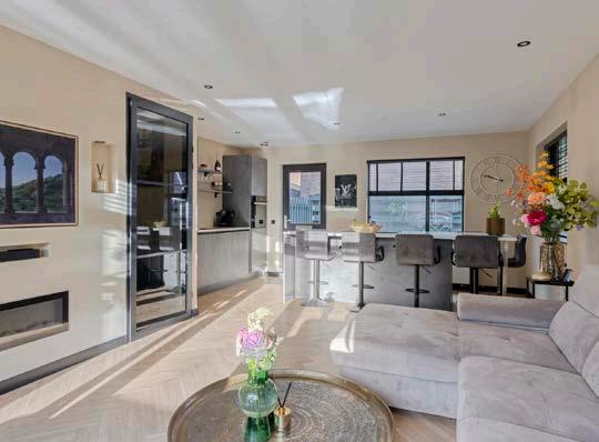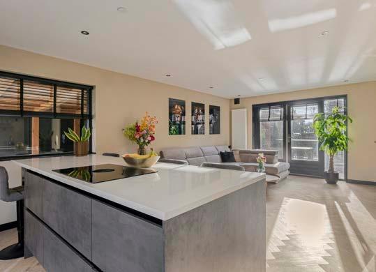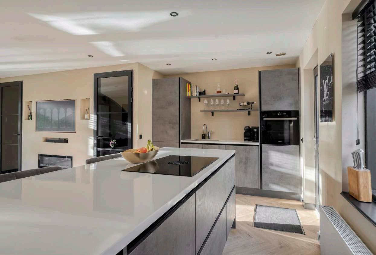 Zeer moderne keuken voorzien van inbouwapparatuur en inbouwverlichting. aan de achterzijde is het toilet en vanuit de woonkamer heb je toegang tot de tuin.