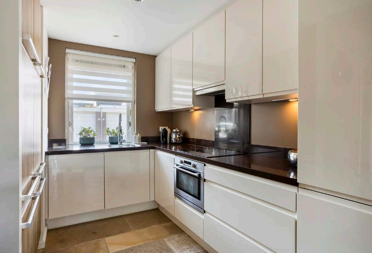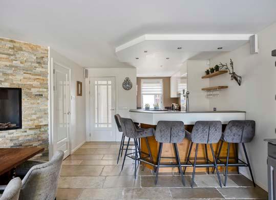 De open keuken bevindt zich aan de voorzijde van de woning en is voorzien van diverse inbouwapparatuur en een bar.
