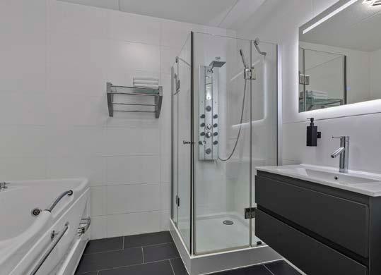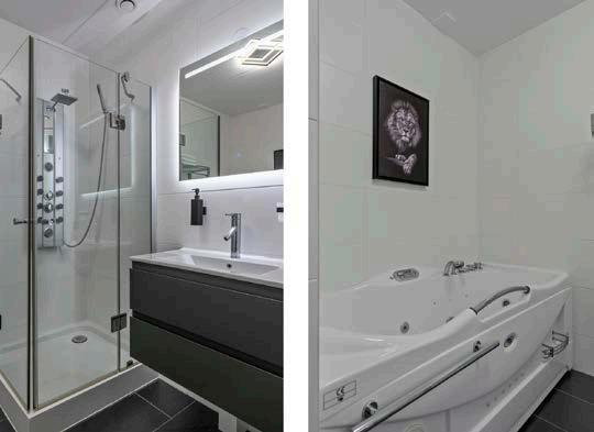 De moderne badkamer is royaal en biedt zowel een douche als een whirlpool ligbad, en een wastafelmeubel, hetgeen zorgt voor luxe en functionaliteit in één.