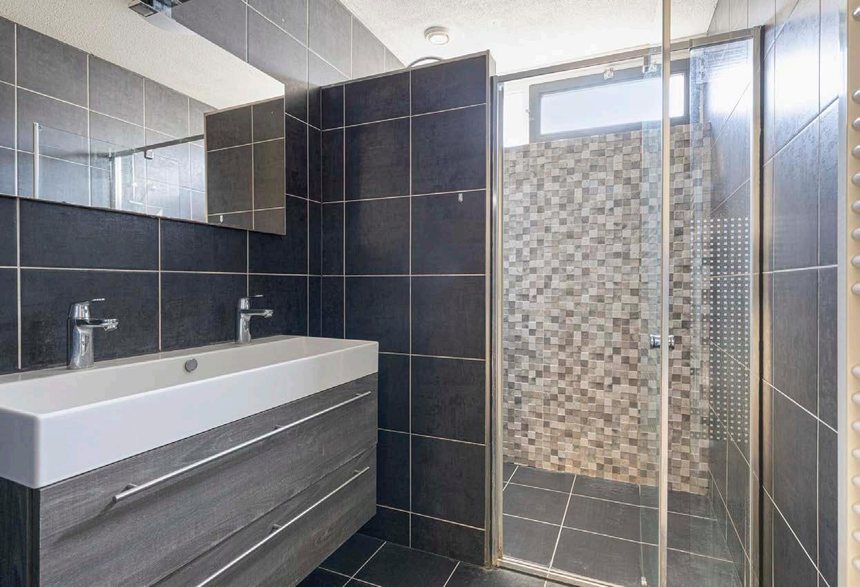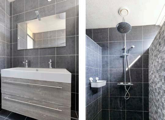 Een stijlvolle badkamer met dubbele wastafel en heerlijke inloopdouche. Een separaat toilet maakt het extra praktisch.