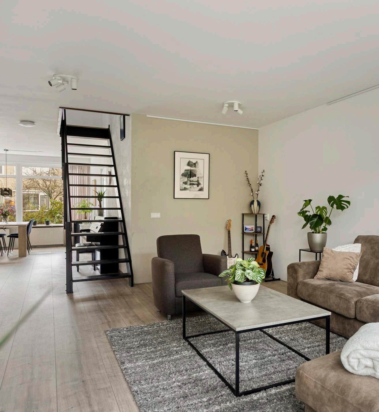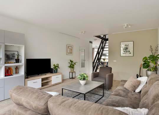 Aan de achterzijde treffen we de woonkamer; hier plof je neer op je bank, met een warme kop thee, terwijl je door het raam uitkijkt op de rustige straat.
