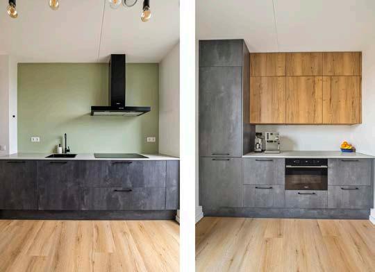 Direct verbonden aan de woonkamer vind je de moderne keuken, die is opgesteld in twee rechte wanden. Het design is stijlvol en praktisch, met grijze onderkasten, houtkleurige bovenkasten en een wit werkblad dat zorgt voor een frisse uitstraling. En laten we de apparatuur niet vergeten: een inductiekookplaat, combi-oven, koelvriescombinatie, vaatwasser en afzuigkap maken koken een feestje. Genoeg opbergruimte voor al je keukengerei zorgt ervoor dat het er altijd netjes en georganiseerd uitziet.
