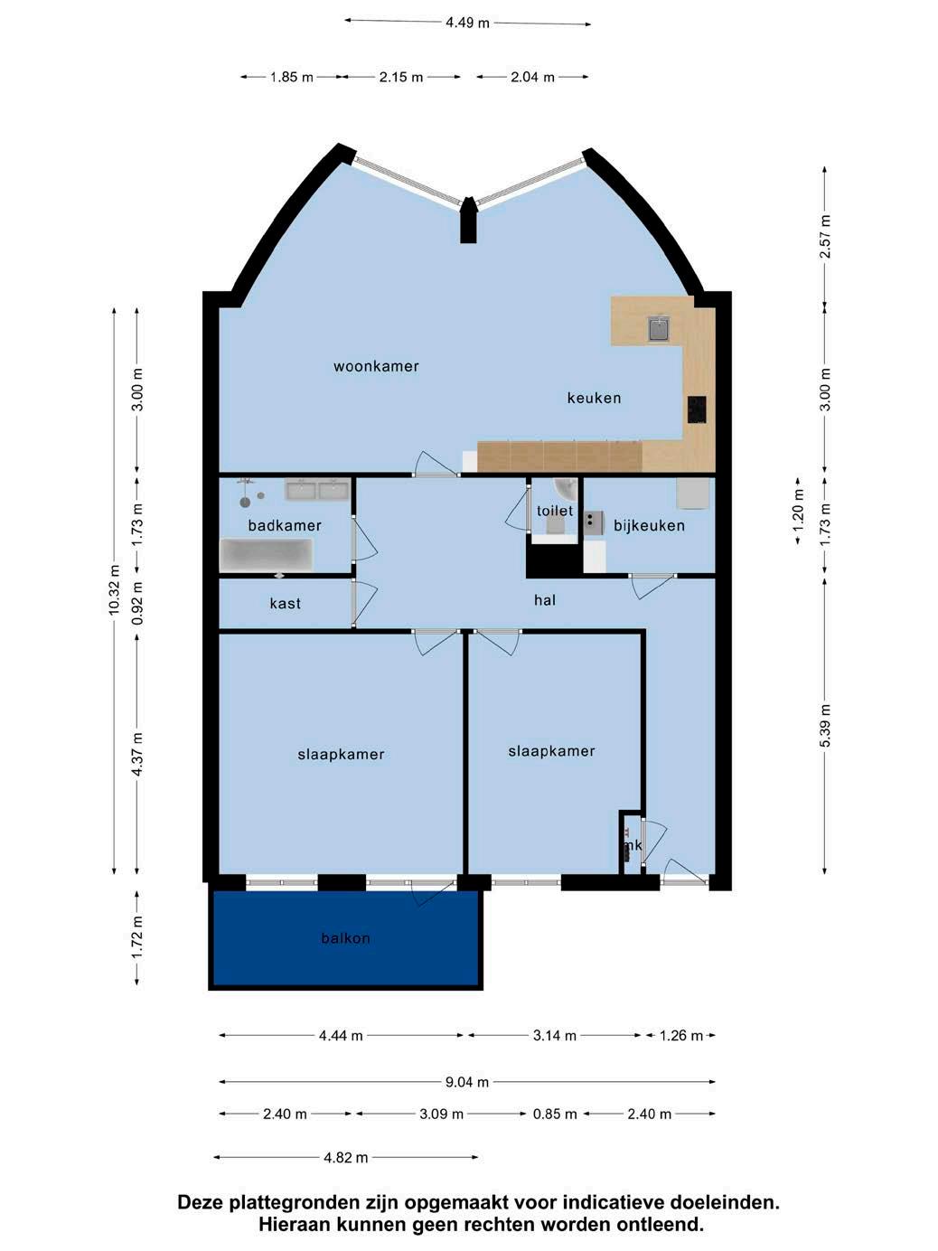 Eenmaal binnen in het appartement op de tweede verdieping tref je een ruime hal, welke toegang geeft tot de meterkast, het toilet, een vaste kast, de handige bijkeuken, beide slaapkamers, de badkamer en natuurlijk de woonkamer.