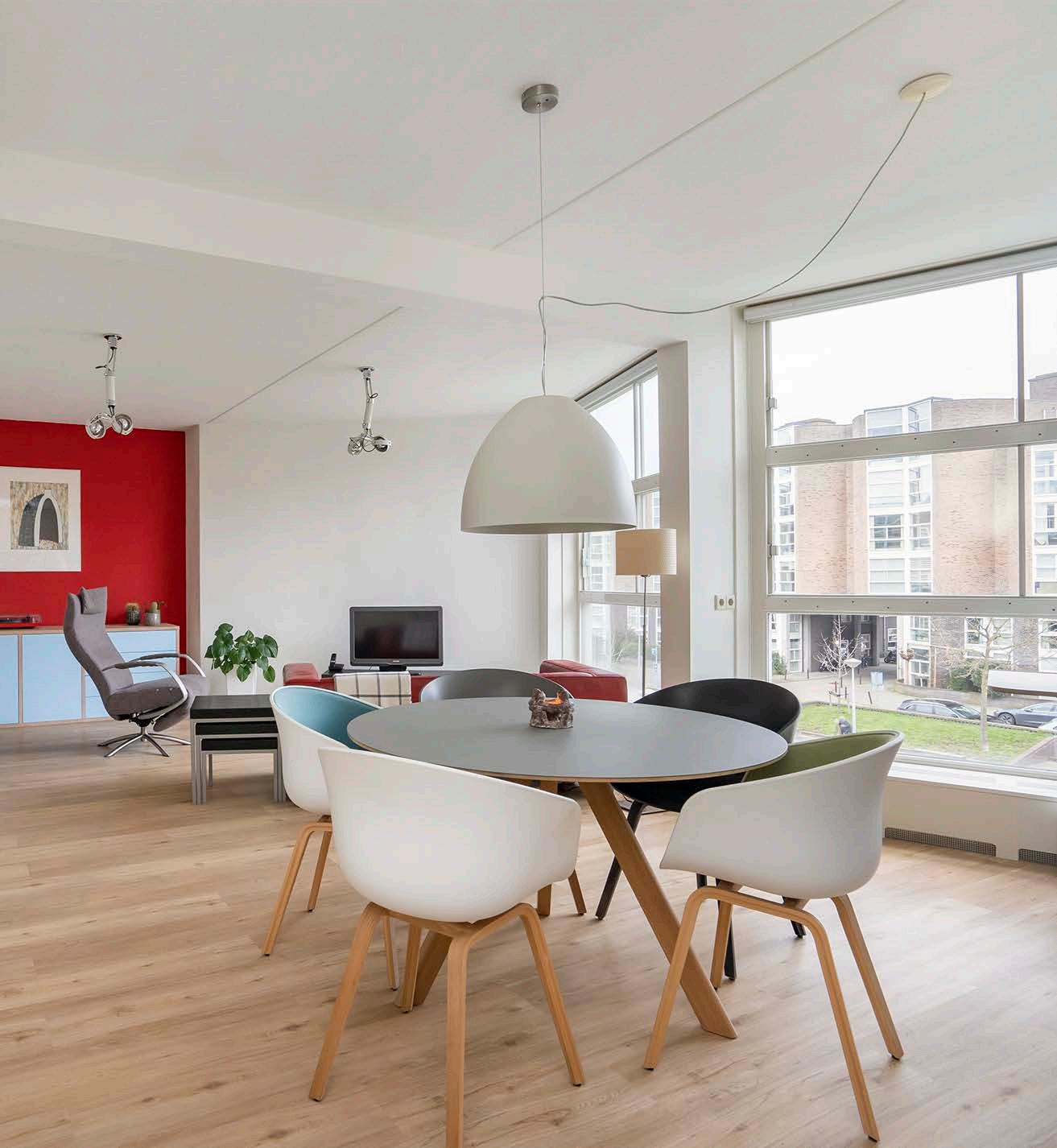 We genieten dagelijks van het schitterende uitzicht over het Meerhuizenplein en de super centrale ligging in de gezellige Rivierenbuurt. De woonkamer met luxe keuken is heerlijk ruim met veel lichtinval en een uitzicht dat we het liefst meenemen...de halfronde muren geven geborgenheid. De slaapkamers zijn fijn ruim opgezet. Een derde slaapkamer is eenvoudig te realiseren maar wij vonden twee grote kamers beter.