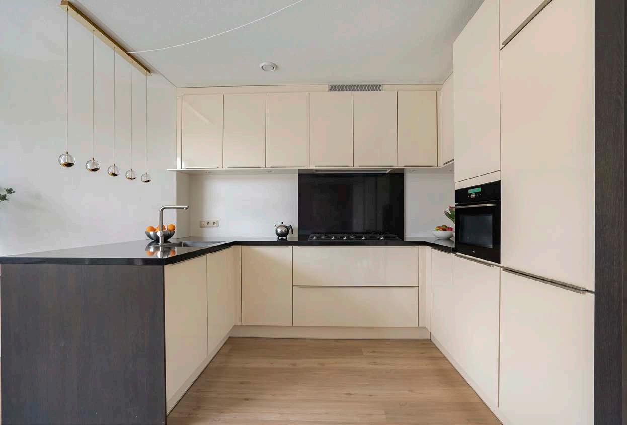 Deze eethoek sluit vervolgens aan op de moderne open keuken. De keuken is geplaatst in een ruime U-opstelling, waarbij je beschikt over veel kast- en werkruimte. Daarnaast ben je hier voorzien van een 5 pits gaskookplaat, afzuigkap, combi oven, vaatwasser, koelkast en een vriezer.