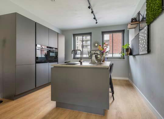De moderne en luxe open keuken, bestaande uit een grote keukenwand en kookeiland met gezellig bar-element, staat hoe dan ook garant voor optimaal kookcomfort. Het geheel is strak afgewerkt met mat saffiergrijze fronten en rijk uitgerust met diverse inbouwapparatuur, zoals een inductiekookplaat met werkbladafzuiging, vaatwasser, combioven met warmhoudlade, stoomoven, kokend waterkraan en een koel-/vriescombinatie.