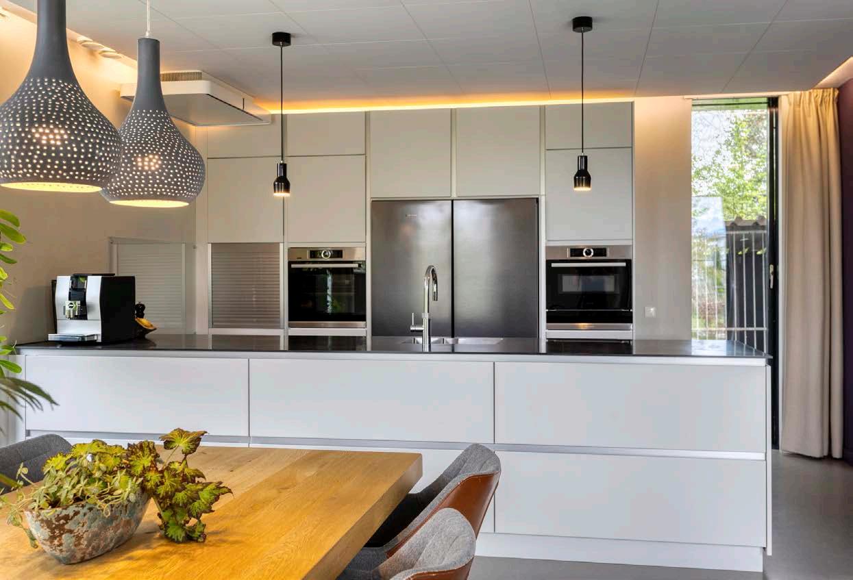 De ruime open keuken is modern en praktisch ingericht met hoogwaardige apparatuur zoals een inductiekookplaat, stoom-oven, combimagnetron, vaatwasser, quooker en meer. Of je nu kiest voor een snelle maaltijd of uitgebreid wilt koken, deze keuken is van alle gemakken voorzien. Direct aan de keuken grenst een bijkeuken, die extra opslagruimte en plek voor een wasmachine en droger biedt.