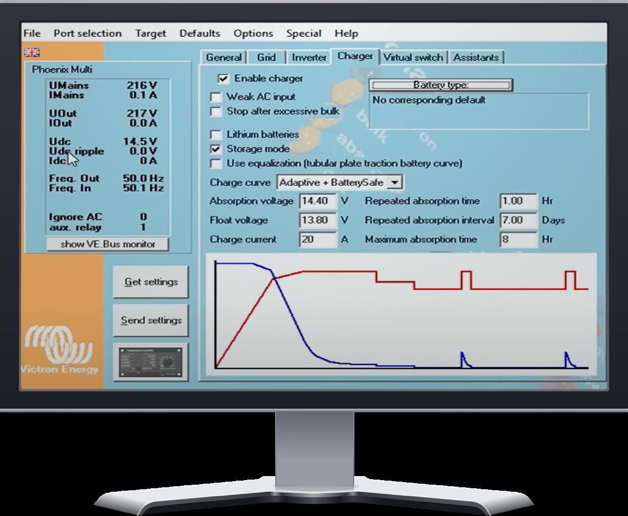 Mit dem optional erhältlichen VE-Bus Interface (Artikel MK3USB) und der frei verfügbaren Software VE-Configure kann die Konfiguration des Multigerätes ganz einfach selbst vorgenommen werden.