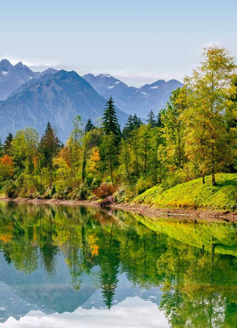 Der Auwald ist geprägt von der Dynamik des Wassers. Dieser feine, vielfältige Lebensraum, von der Iller geschaffen, der sich als wahre Augenweide eröffnet: Der Flusslauf, gemächlich glitzernd im Sommer, türkis leuchtend im Winter oder dunkel strömend im Frühjahr, begleitet mal sichtbar, mal nur als sanftes Rauschen die Wege. Der Auwald ist licht und jung und verzaubert mit seinem Spiel aus Sonnenkringel und Blätterschatten. Die Hochmoore der Hörnerdörfer - in den Allgäuer Bergen und doch in einer eigenen Welt: Alles wirkt reduzierter, klarer, fast nordisch. Die Schritte federn, denn der Boden ist weich und nachgiebig. In dicken Polstern hingetupfte Moose und Wasserflächen, die einem dunkel poliert entgegenglänzen. Der Wald im Moor ist vor allem Waldrand, dort wo Tanne und Birke Farnen, Gräsern und dem eigenen Gemüt einen sicheren Rahmen verleihen.