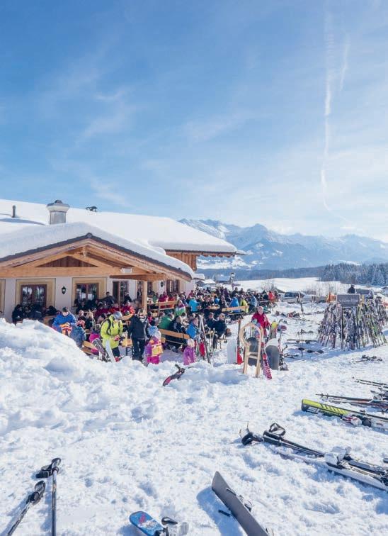 spät im Winter, am besten auf den Wander- und Spazierwegen. Kommt einem der dicke Schnee dazwischen, funktioniert es immer noch, denn dann warten die Winterwanderwege, präpariert und gewalzt. Natürlich haben mit dem Schnee auch die Pisten und Loipen und die Rodelbahnen ihren großen Auftritt – Wintersport in all seinen Ausprägungen ist schließlich Herzenssache im Allgäu. In den sechs Skigebieten, die zur Wahl stehen, überwiegen die familienfreundlichen Abfahrten, inklusive Übungsliften und Skischulen, die schon Talente wie Weltcup-Fahrer Manuel Schmid und seinen Weltmeister-Bruder Alex gefördert haben. Fortgeschrittene kommen auch nicht zu kurz und dürfen gerne auf Pisten wie der „Märchenwiese“ ihr Können unter Beweis stellen.