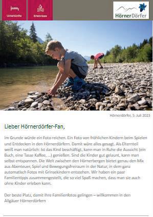 Auch wenn der Trend immer mehr zur Online-Information geht, kann auf Printanzeigen nicht ganz verzichtet werden. Bei den Zielgruppen der Hörnerdörfer gibt es immer noch eine Vielzahl an Gästen, die für ihre Urlaubsplanung ein Printprodukt der Online-Recherche vorziehen, so dass in ausgesuchten Medien diesen Bedürfnissen Rechnung getragen wird.