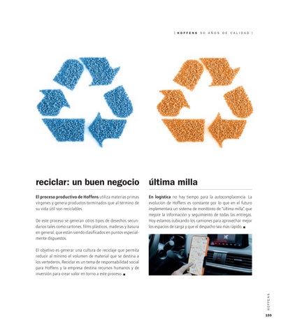 El objetivo es generar una cultura de reciclaje que permita reducir al mínimo el volumen de material que se destina a los vertederos. Reciclar es un tema de responsabilidad social para Hoffens y la empresa destina recursos humanos y de inversión para crear valor en torno a este proceso. •