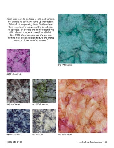 Ideal uses include landscape quilts and borders, but quilters no doubt will come up with dozens of ideas for incorporating these Bali beauties in their projects. And imagine all the possibilities for appliqué, art-quilting and home décor! Style #841 shows more as an overall tonal fabric. Style #842 offers varied areas of pure-color mottling next to light-colored texture-and-mottle areas, so it has more “movement.”