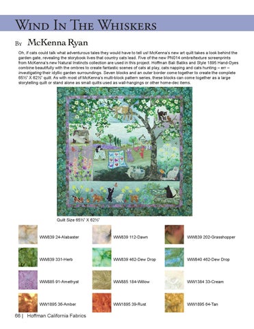 Wind In The Whiskers By Oh, if cats could talk what adventurous tales they would have to tell us! McKennaâs new art quilt takes a look behind the garden gate, revealing the storybook lives that country cats lead. Five of the new PN014 ombre/texture screenprints from McKennaâs new Natural Instincts collection are used in this project. Hoffman Bali Batiks and Style 1895 Hand-Dyes combine beautifully with the ombres to create fantastic scenes of cats at play, cats napping and cats hunting â err â investigating their idyllic garden surroundings. Seven blocks and an outer border come together to create the complete 65½â X 62½â quilt. As with most of McKennaâs multi-block pattern series, these blocks can come together as a large storytelling quilt or stand alone as small quilts used as wall-hangings or other home-dec items.