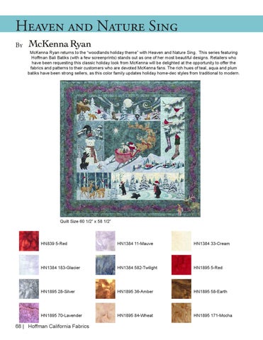 Heaven and Nature Sing By McKenna Ryan returns to the “woodlands holiday theme” with Heaven and Nature Sing. This series featuring Hoffman Bali Batiks (with a few screenprints) stands out as one of her most beautiful designs. Retailers who have been requesting this classic holiday look from McKenna will be delighted at the opportunity to offer the fabrics and patterns to their customers who are devoted McKenna fans. The rich hues of teal, aqua and plum batiks have been strong sellers, as this color family updates holiday home-dec styles from traditional to modern.