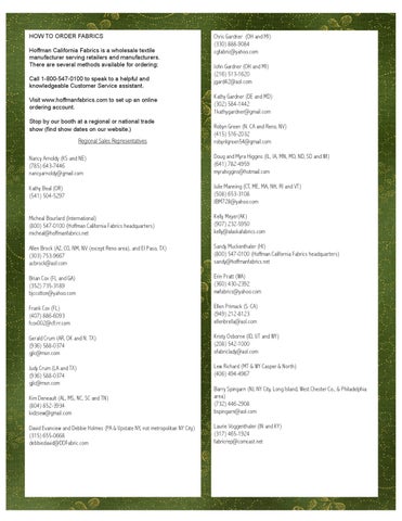 Chris Gardner (OH and MI) (330) 888-9084 cgfabric@yahoo.com John Gardner (OH and MI) (216) 513-1620 jgard42@aol.com Kathy Gardner (DE and MD) (302) 584-1442 1kathygardner@gmail.com Robyn Green (N. CA and Reno, NV) (415) 516-2032 robynlgreen54@gmail.com