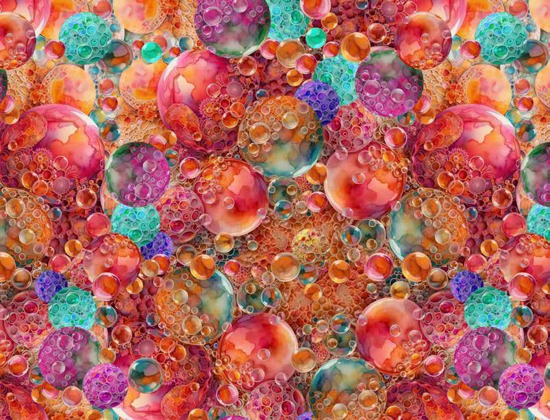 “Dive into a world of color and movement with Bubblelicious. This is Marlies’ third fabric collection, inspired by the sparkling beauty of bubbles and waterdrops. This collection bursts with energy, featuring two focus prints showcasing delicate droplets and floating bubbles that shimmer with life. Complementing these designs are stunning ombre fabrics, where colors blend seamlessly, creating a dynamic and playful effect. Bubblelicious brings a fresh, effervescent touch to every project. Let your creativity bubble over!