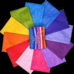 100% COTTON. EACH COLORWAY CONTAINS 12 FAT QUARTERS IN EACH BUNDLE, EXCEPT FOR THE RAINBOW COLORWAY WHICH CONTAINS 14 FAT QUARTERS. BUNDLES SOLD SEPARATELY.