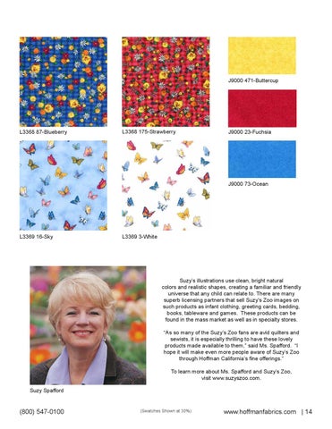 Suzy’s illustrations use clean, bright natural colors and realistic shapes, creating a familiar and friendly universe that any child can relate to. There are many superb licensing partners that sell Suzy's Zoo images on such products as infant clothing, greeting cards, bedding, books, tableware and games. These products can be found in the mass market as well as in specialty stores. “As so many of the Suzy’s Zoo fans are avid quilters and sewists, it is especially thrilling to have these lovely products made available to them,” said Ms. Spafford. “I hope it will make even more people aware of Suzy’s Zoo through Hoffman California’s fine offerings.” To learn more about Ms. Spafford and Suzy’s Zoo, visit www.suzyszoo.com. Suzy Spafford