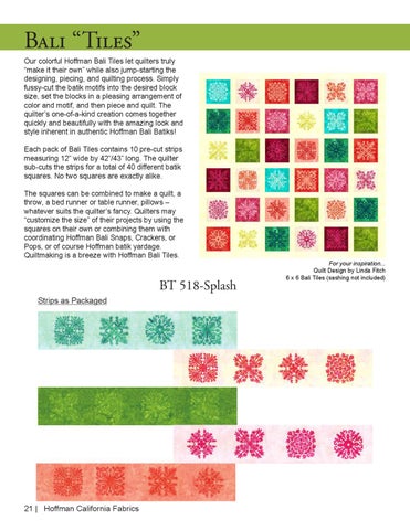 Our colorful Hoffman Bali Tiles let quilters truly “make it their own” while also jump-starting the designing, piecing, and quilting process. Simply fussy-cut the batik motifs into the desired block size, set the blocks in a pleasing arrangement of color and motif, and then piece and quilt. The quilter’s one-of-a-kind creation comes together quickly and beautifully with the amazing look and style inherent in authentic Hoffman Bali Batiks! Each pack of Bali Tiles contains 10 pre-cut strips measuring 12” wide by 42”/43” long. The quilter sub-cuts the strips for a total of 40 different batik squares. No two squares are exactly alike. The squares can be combined to make a quilt, a throw, a bed runner or table runner, pillows – whatever suits the quilter’s fancy. Quilters may “customize the size” of their projects by using the squares on their own or combining them with coordinating Hoffman Bali Snaps, Crackers, or Pops, or of course Hoffman batik yardage. Quiltmaking is a breeze with Hoffman Bali Tiles.