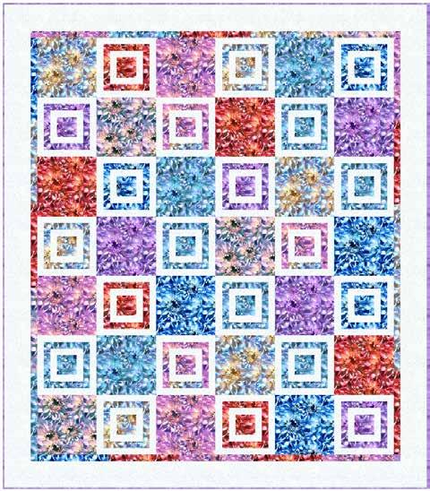 Quilt design by Quilt Moments, featuring Bloom, a Hoffman Spectrum Digital Print collection. Flowers bloom in a garden of beautiful fabrics. The flower blocks are easily constructed with squares and rectangles.