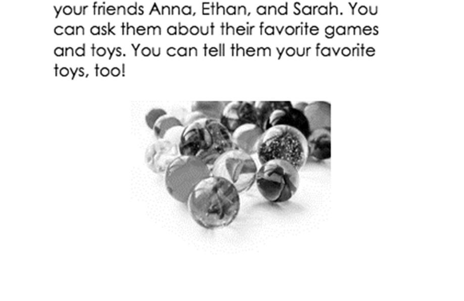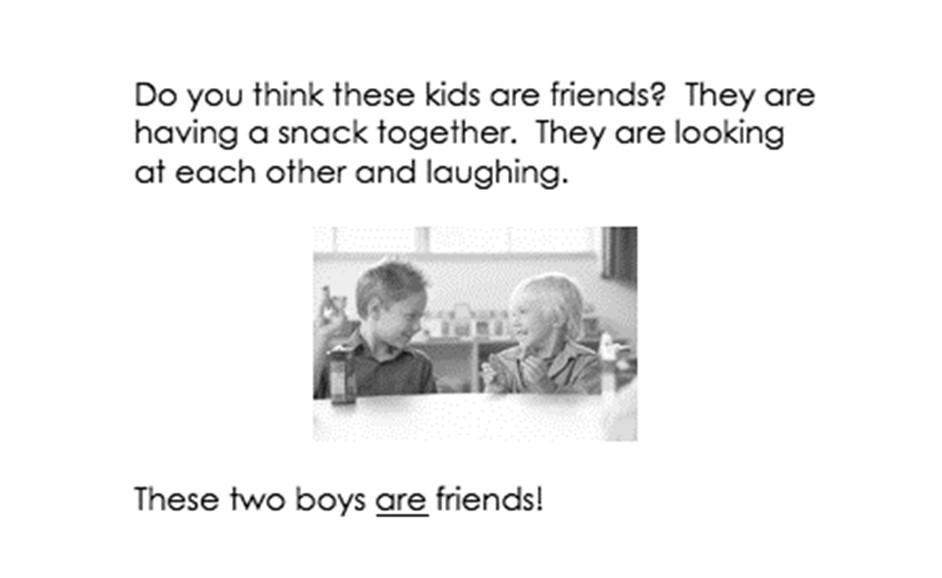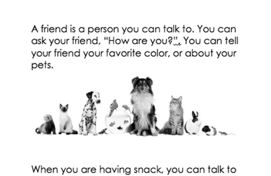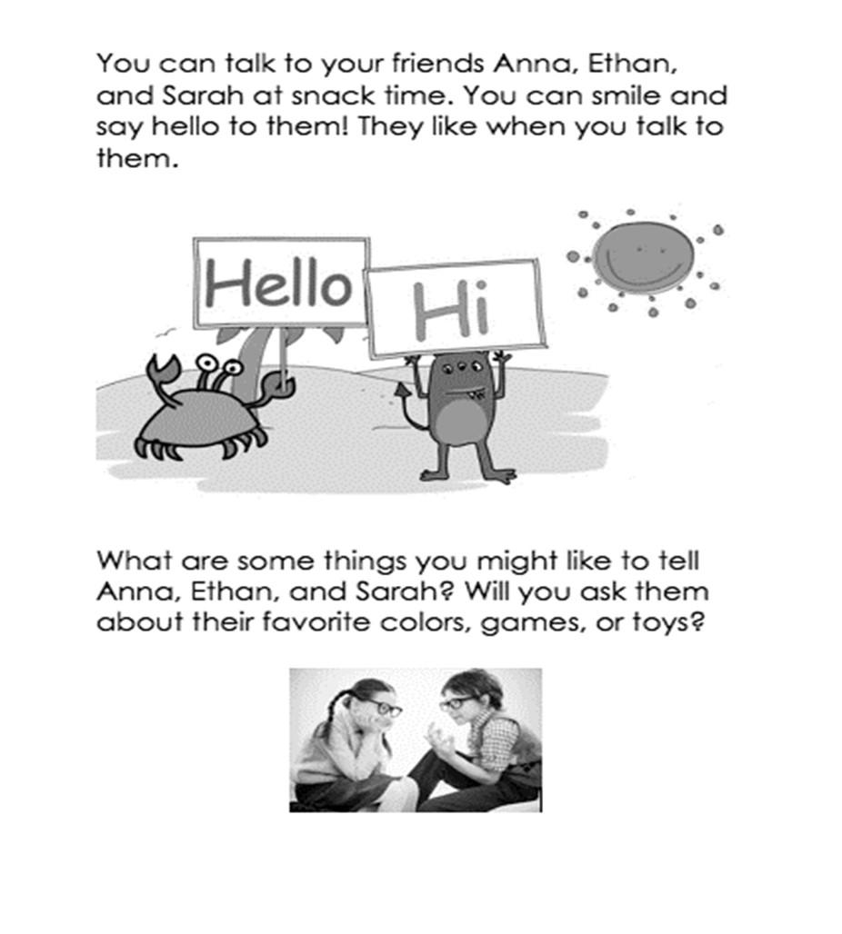 Socialstory.Thesocialstory(seeFigure1)wasfourpageslong,createdbythe paraprofessional,andsuggestedtopicsforsocialinitiationstopeers,suchaspets,favoritecolors, games,andtoys.Thetopicswerechosenbasedontheparaprofessional’sdirectobservationsof typicalpeers’conversationsintheclassroom.Noidentifyinginformationorinformationspecific tothepeerswasincludedinthestory.Althoughphotographsanddrawingswereutilizedinthe story,theyweregenericrepresentationsofitemsintheclassroomandfriends.Noactual