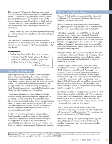 “ What I’ve learned is that as a student, it’s important to make yourself visible and your passions known – you can’t let fear block you from trying.” — Michael Seiman Rising to the Challenge Beginning in January 2013, student-innovators from the School of Engineering and Applied Science and other disciplines formed teams and submitted ideas for business plans. Student progress was evaluated and monitored over six months. The contest culminated in a presentation of final concepts and business plans to a select panel of judges in April. The judging committee consisted of Hofstra University faculty and administrators, and CPX officials. “Entrepreneurship has always been the key to a thriving economy, leading to growing companies, employment and innovation,” said Dr. Simon Ben-Avi, dean of Hofstra’s School of Engineering and Applied Science and a competition judge. “In today’s sputtering economic climate, this kind of creativity is more necessary than ever. We are delighted to host this competition and to hone our students’ skills as innovators and future leaders.” A total of 11 projects were presented for competition. Based on market research, necessity was the mother of invention for these creative ventures, from revamping an existing product or concept in the consumer market to simplifying present technology used in daily business – the focus was on improving present-day efficiency and ingenuity.