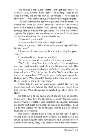 “He thinks I can avoid chemo.” My gut reaction is to comfort Cole, always. Even now. “I’m getting these shots once a month, and they’re hoping the tumors––” he winces at the word, “––will shrink enough to remove through surgery.” The skin between his eyebrows pinches with concern. He unzips his jacket but doesn’t remove it as he makes his way toward the island. I remain fixed behind the slab of granite, forcing him to decide our proximity. He leans his elbows against the adjacent corner, closer than he would have been across the island but not directly beside me. “When will you know?” “I have another MRI in about eight weeks.” His jaw tightens. “What does your mother say? Will she be with you?” I lean my elbows onto the island, mimicking his pose. “She…” I can already see his teeth clenching. “It’s over an hour drive, and you know how she––” “You’re her daughter, for god’s sake.” He straightens up, one hand running back through his mess of hair. His eyes sweep the room as though she’s there, and this rant is directed at her. “She’s in perfect health. You’re not. She can make the damn drive.” When his gaze finds mine again, he finishes with, “You shouldn’t bother telling her how it goes. If she wants to know, she can come.” I stare into his narrow black pupils, watch the way his chest rises and falls behind his plaid button-up. I can’t help but chuckle. “You always get so worked up when she’s like this.” He lets out a shaky laugh and it sounds like an exhale. You always. I love how the phrase tastes on my tongue. Like a memory with eternal life. Like something permanent between us. There isn’t much permanent between us, anymore. I hold on to two simple words as though they’re pinkies locked together in a promise. His stance shrinks back down, as though he’s a cobra coiling back in on himself after a strike. His teeth catch his lower lip and his gaze flicks between me and the door before he murmurs a soft, “Hey,” and gestures for me to come closer. Windmill 65