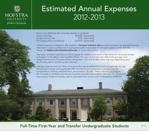 Direct costs (billed by the University directly to students): Tuition and Fees $35,800 (estimated) Student Activity Fee $150 (estimated) On-Campus Room and Board $14,010 (estimated) Hofstra University is pleased to offer students a four-year locked-in rate for tuition and fees. The estimated annual fixed rate for tuition and fees (not including the student activity fee) for first-year students will be $38,500. Please visit hofstra.edu/lockedintuitionrate for more information. The tuition and fees noted above will be greater for students who enroll in the School for University Studies or Program for Academic Learning Skills (PALS). The room and board cost reflects the average room charge and minimum first-year student dining plan. Individual student costs may vary, depending upon the housing option and dining plan selected. Average expenses that the Office of Financial Aid uses to determine award packages also include allowances for books and supplies ($1,000), and personal/miscellaneous expenses such as transportation, clothing, entertainment, and recreation ($3,083). These costs are not billed by the University to students, but are out-of-pocket expenses that students may incur. For calculating financial aid, Hofstra University uses an estimated total annual cost of attendance of $54,043.