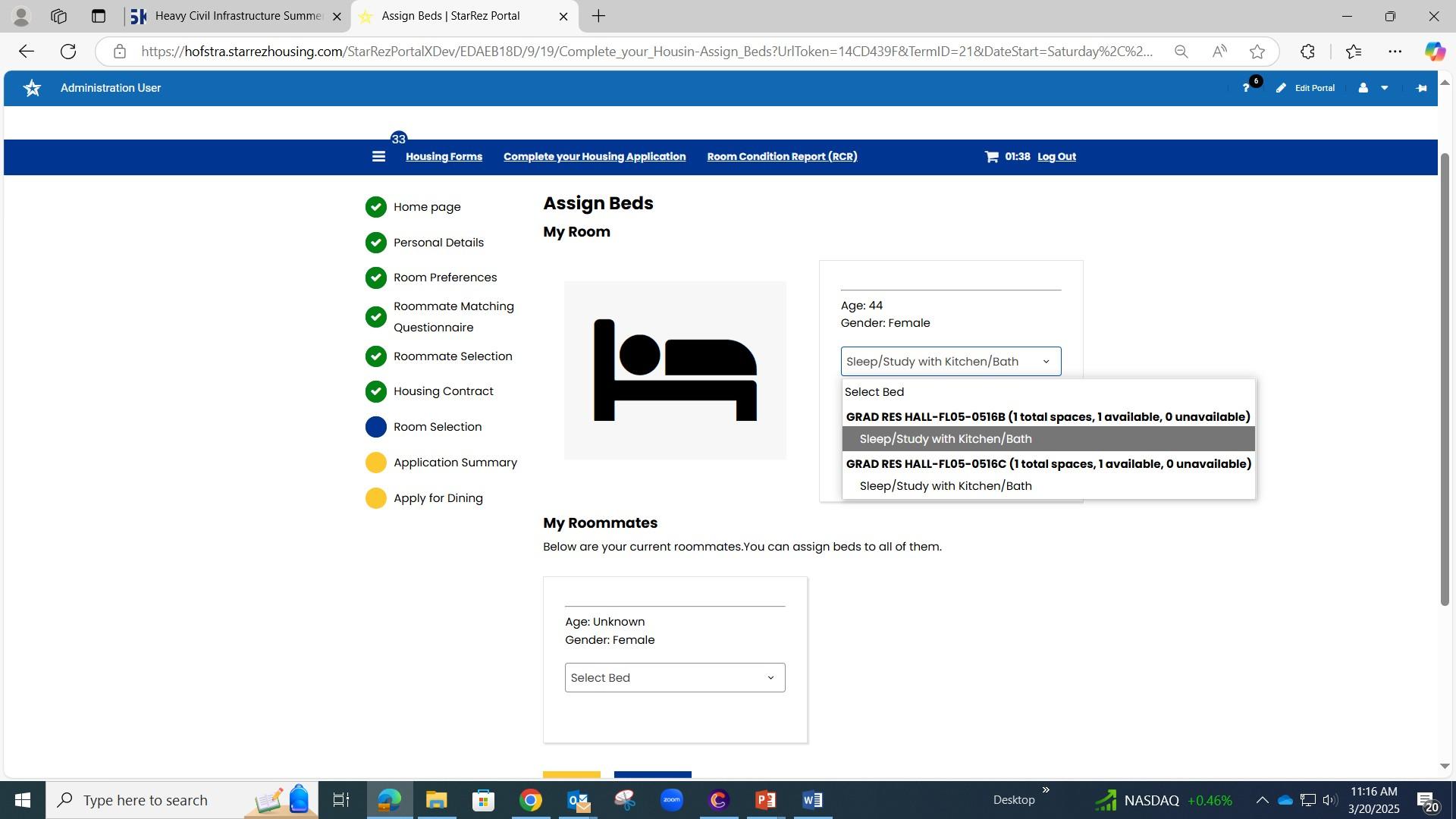 “Select ”your “Bed” from the drop-down menu. Verify the building, floor and room number are accurate and if there is a space available. Click on “Sleep/Study w/out toilet/Bath” then click on “Assign Beds”.