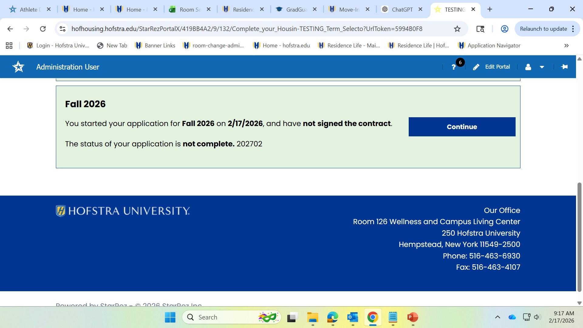 BEFORE you click on the “Save and Continue” button, be sure you confirm the building, floor and room number as this will be your housing assignment for the next academic year.