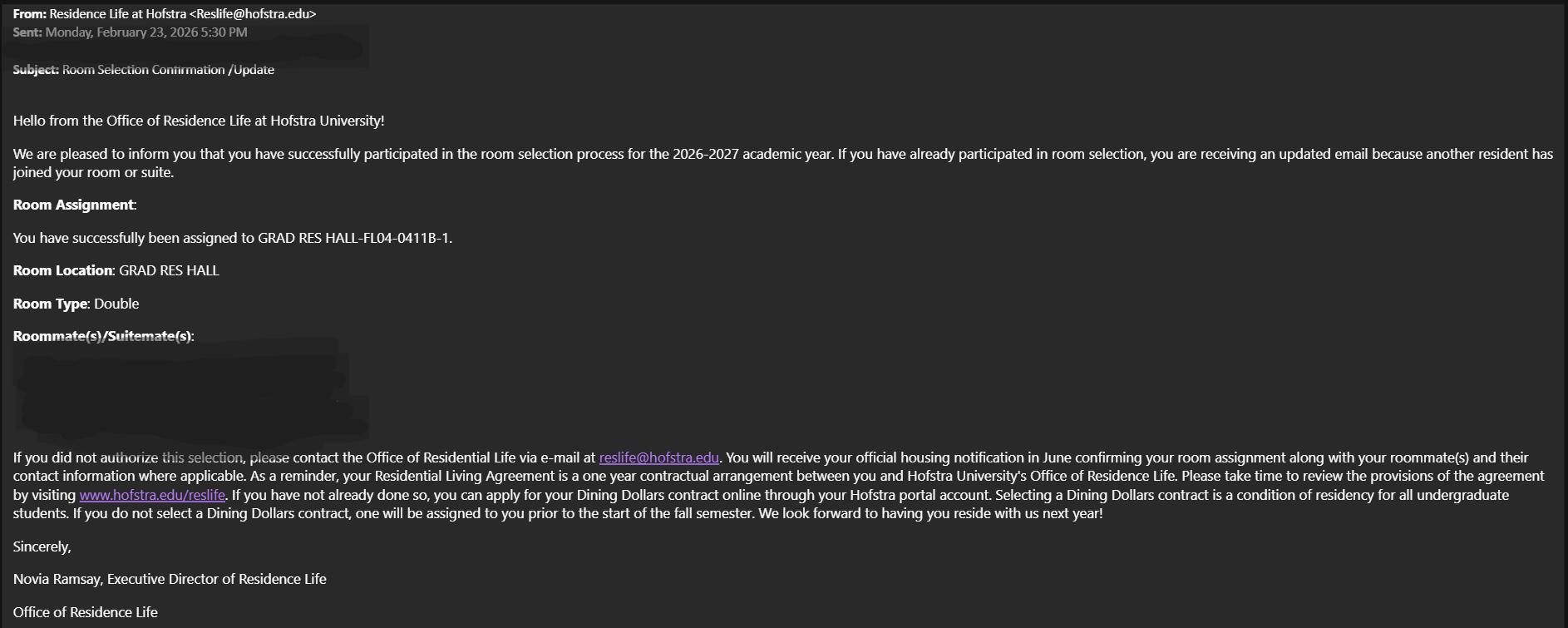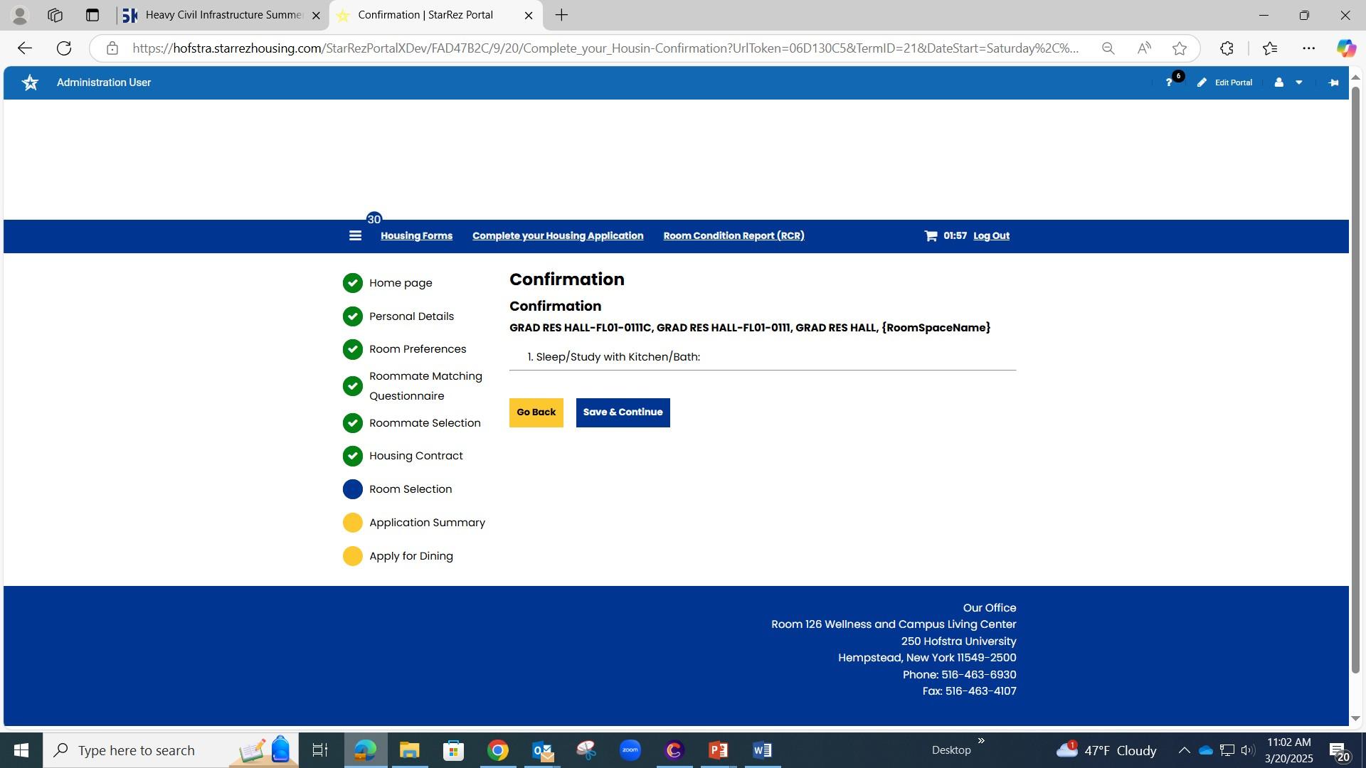 Once confirmed, click on the “Save and Continue” button. You have now successfully participated in the General Room Selection Process! Students will receive an email to their Hofstra Pride account confirming they have participated in the General Room Selection Process.