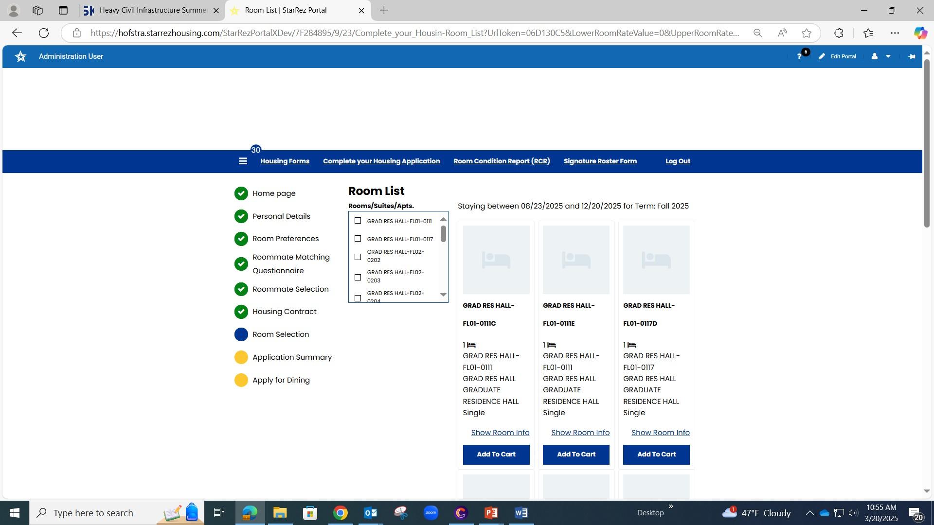 From the Room List, students will have the ability to search for a room to select. Once you have selected a room, Click on “Add to Cart”.