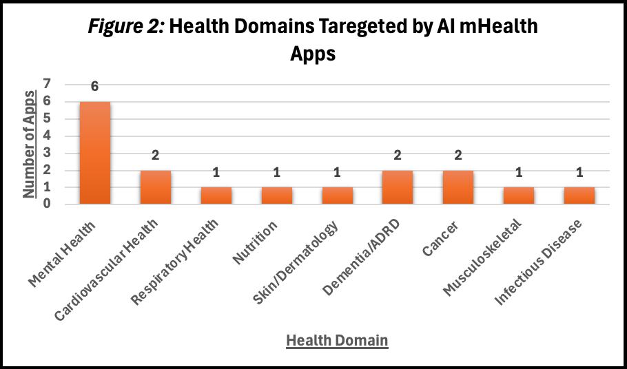 • Most apps targeted mental health (n=6), with others addressing dementia, cardiovascular disease, cancer, and niche areas like nutrition and respiratory health (Fig 2).