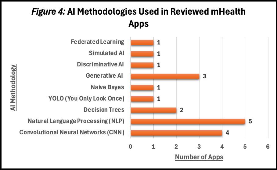 • The findings confirm an increasing global adoption of AI in mHealth applications. Its capabilities are vast if placed in healthcare systems with thoughtful consideration of equity, privacy, and trust.