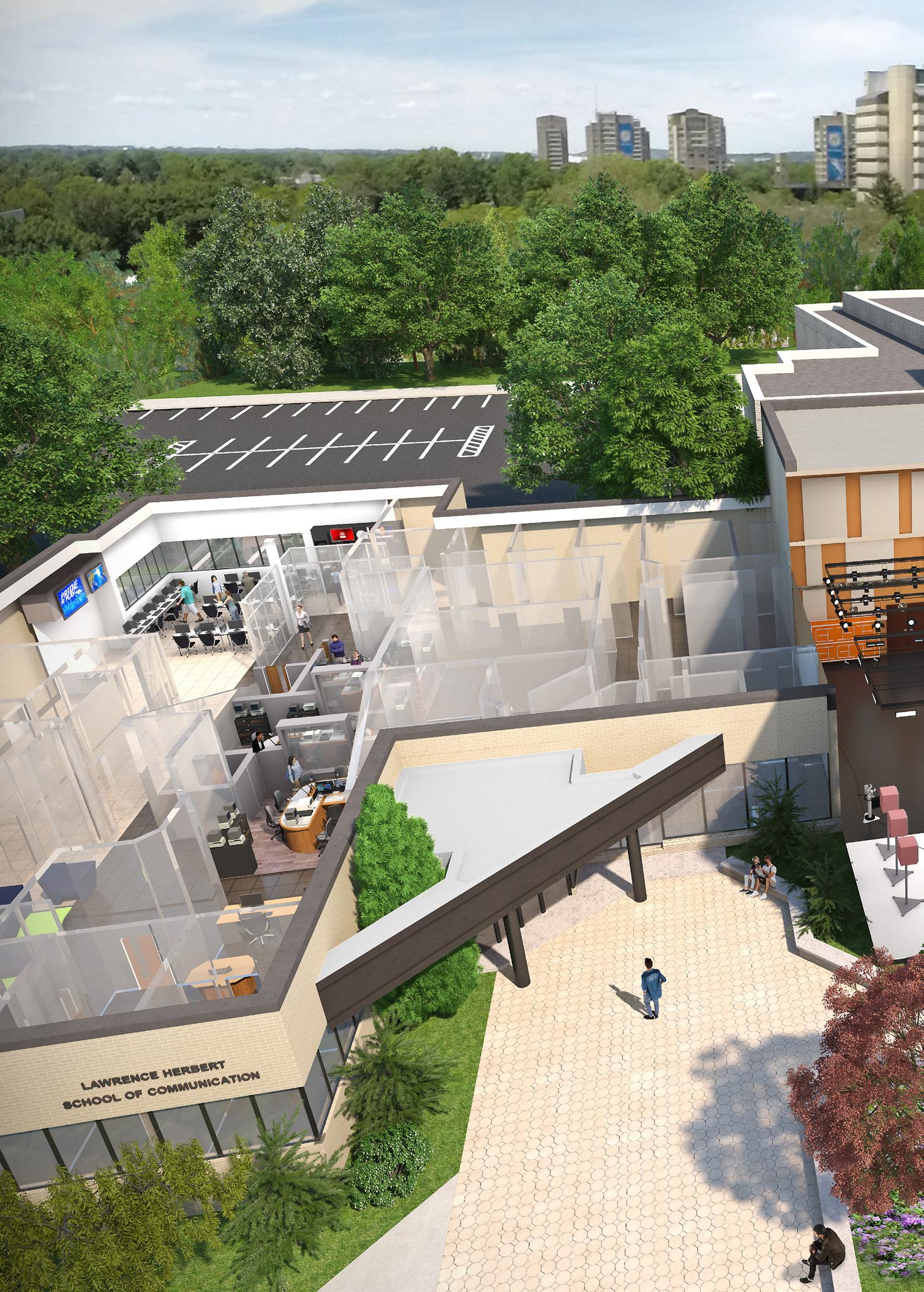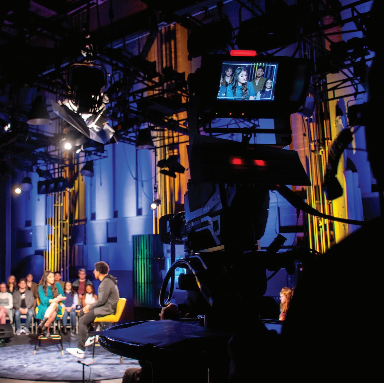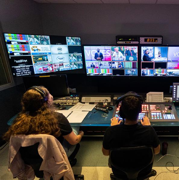 Production studios, such as the three-story, 3,750 square-foot Studio A, and Studio B for news production, feature 4K/UHD broadcast cameras. A post-production facility includes an editing classroom, screening room, color correction suite, and Foley/ADR audio studio. Students can record podcasts and mix live music and talk shows in the multimedia audio studio and control room. Industry standard field and mobile equipment is available for coursework and projects.