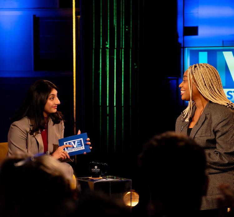 Herbert School students produce live coverage of a variety of Hofstra Pride intercollegiate games in a new sports television control room. WRHU Studios and Sports Desk are capable of creating professional audio, video, and social media content. The Content Suite provides a collaborative and flexible meeting space. The Vertical Video Lab is outfitted with a green screen, teleprompter, and editing software to create high-quality content for social media.