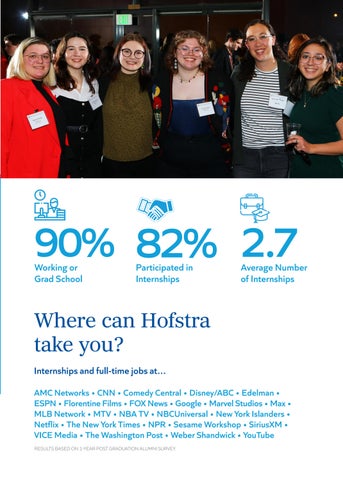 AMC Networks • CNN • Comedy Central • Disney/ABC • Edelman • ESPN • Florentine Films • FOX News • Google • Marvel Studios • Max • MLB Network • MTV • NBA TV • NBCUniversal • New York Islanders • Netflix • The New York Times • NPR • Sesame Workshop • SiriusXM • VICE Media • The Washington Post • Weber Shandwick • YouTube Where can Hofstra take you?