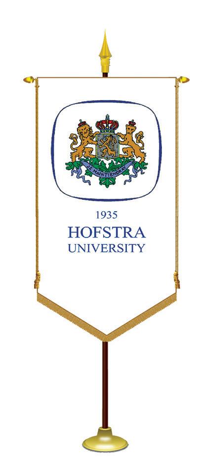 The gonfalon of the Peter S. Kalikow School of Government, Public Policy and International Affairs is derived from the Dutch city of The Hague, the seat of government of the Netherlands and the seat of the United Nations International Court of Justice. The words “vrede” and “recht” translate into “peace” and “justice,” the cornerstones of the Kalikow School. The center of the gonfalon includes the three branches of the U.S. government, with the crown being replaced by people, symbolizing a government “by the people.” The gonfalon was created by Peter S. Kalikow, a proud alumnus of Hofstra University.