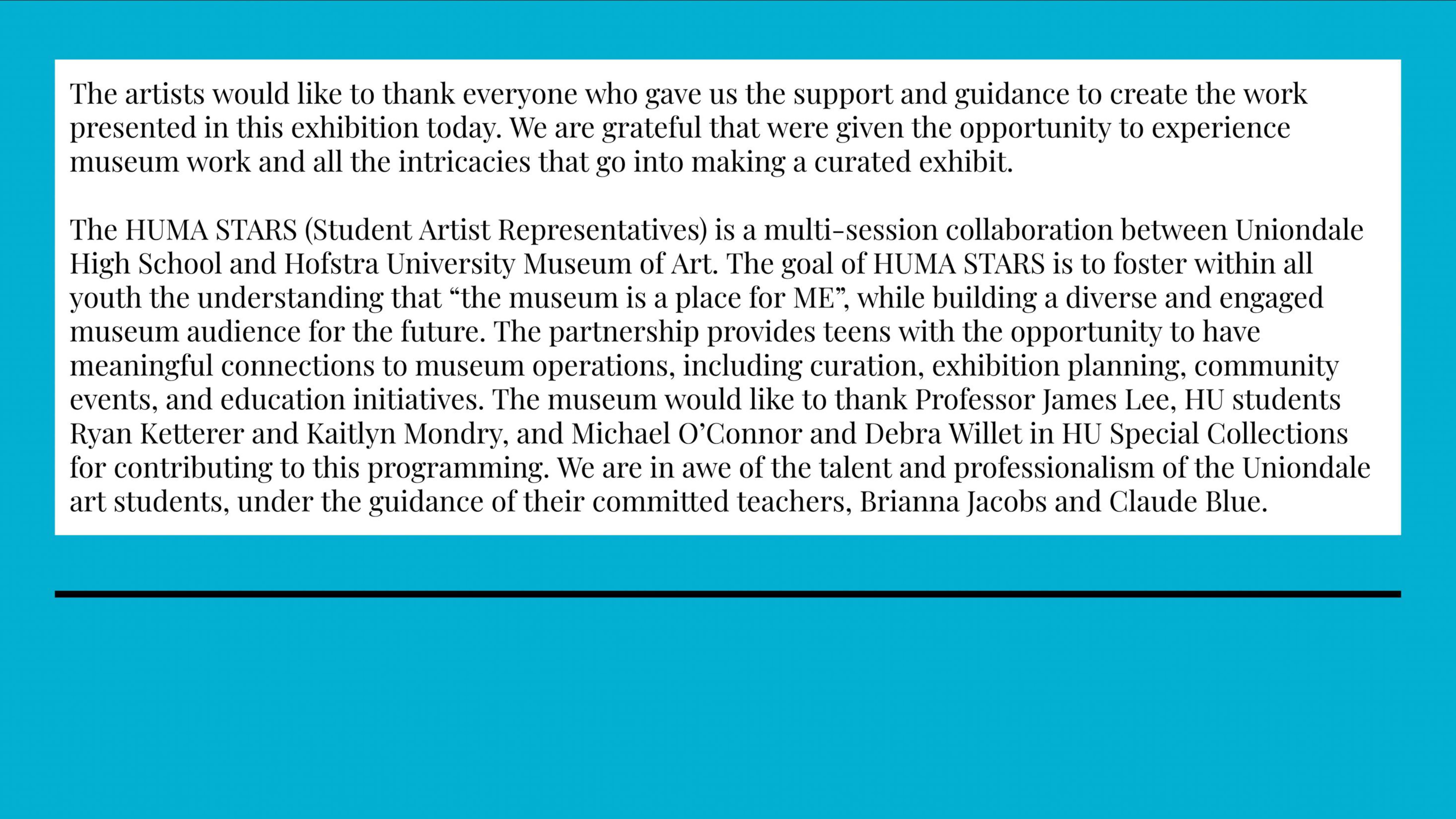 1"11'-.i._ presented in this exhibition today. We are grateful that were given the opportunity to experience museum work and all the intricacies that go into making a curated exhibit. .....'I'llThe HUMA STARS(Student Artist Representatives) is a multi-session collaboration between Uniondale High School and Hofstra University Museum of Art. The goal of HUMA STARSis to foster within all