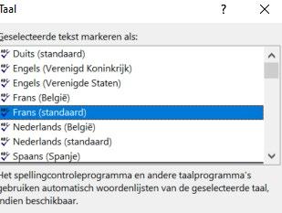 Utilisez les fonctionnalités offertes par le logiciel que vous utilisez ! Le correcteur orthographique dans WORD soulignera non pas toutes mais une bonne partie des fautes, à l’aide du bouton ‘controleren’ ou en bas de votre écran, vous pouvez changer la langue du correcteur d’orthographe. En cliquant sur la langue, vous voyez une liste de langues. Choisissez le français comme langue de référence.
