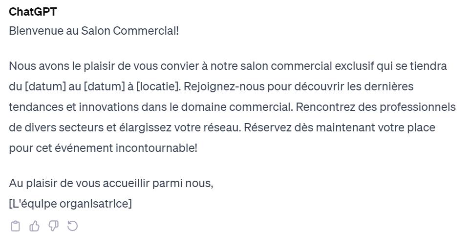 Exemple : “Schrijf een uitnodiging in het Frans voor een beurs”: