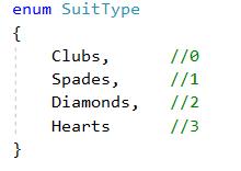 Zo kunnen we een toekenning doen aan een nieuwe variabele ‘suit’ van het type van onze enum SuitType.