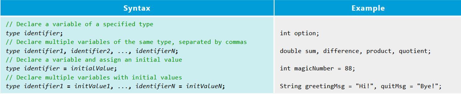 Bemerk dat een punt-komma (;) vereist is na iedere declaratie want een declaratie is een statement waarmee je aan de compiler eigenlijk wil zeggen ‘einde zin’.