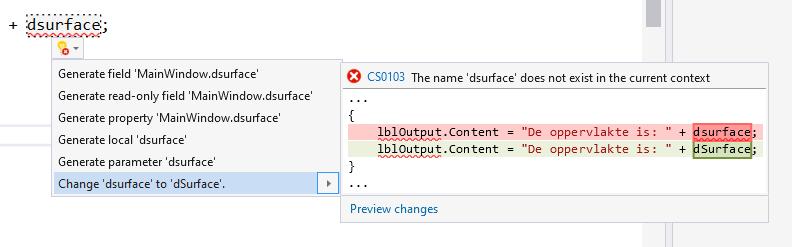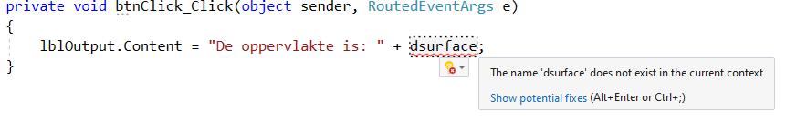 We hebben de letter S van de variabele veranderd in een kleine letter s. De compiler toont een foutmelding dat het symbool variabele dsurface niet kan worden gevonden en dat klopt omdat we een variabele met de naam dSurface hebben gedeclareerd maar geen variabele met de naam dsurface